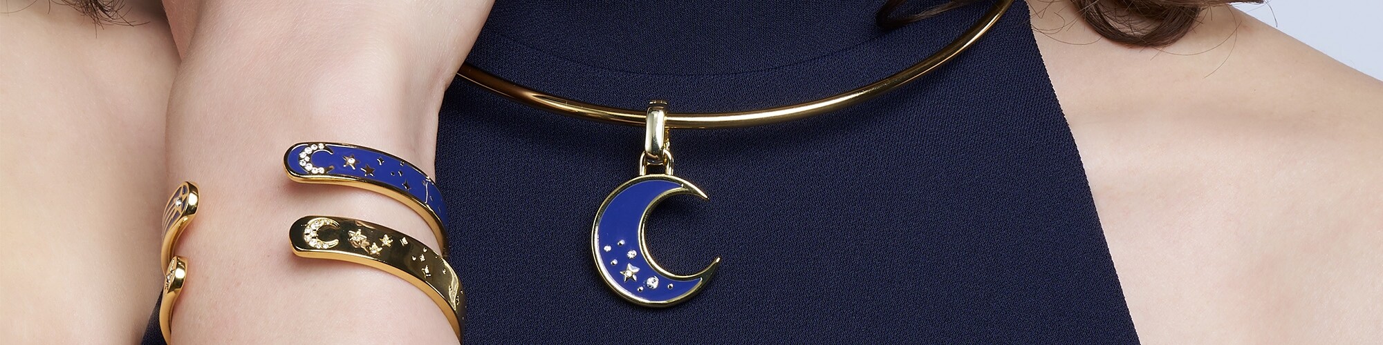 Moon Bracelet manchette Bangle Up Moon en laiton doré et email